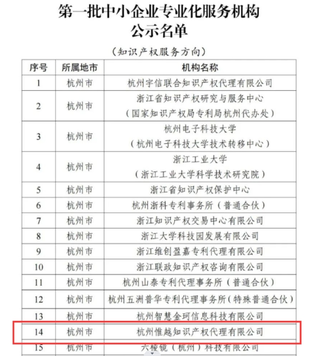 喜報!!關(guān)于杭州惟越知識產(chǎn)權(quán)代理有限公司入選浙江省首批中小企業(yè)專業(yè)化服務(wù)機(jī)構(gòu)的公示